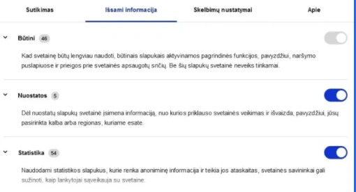 • Ar tinklalapio slapukai suskirstyti į kategorijas (pvz. būtini, statistiniai, rinkodaros)?